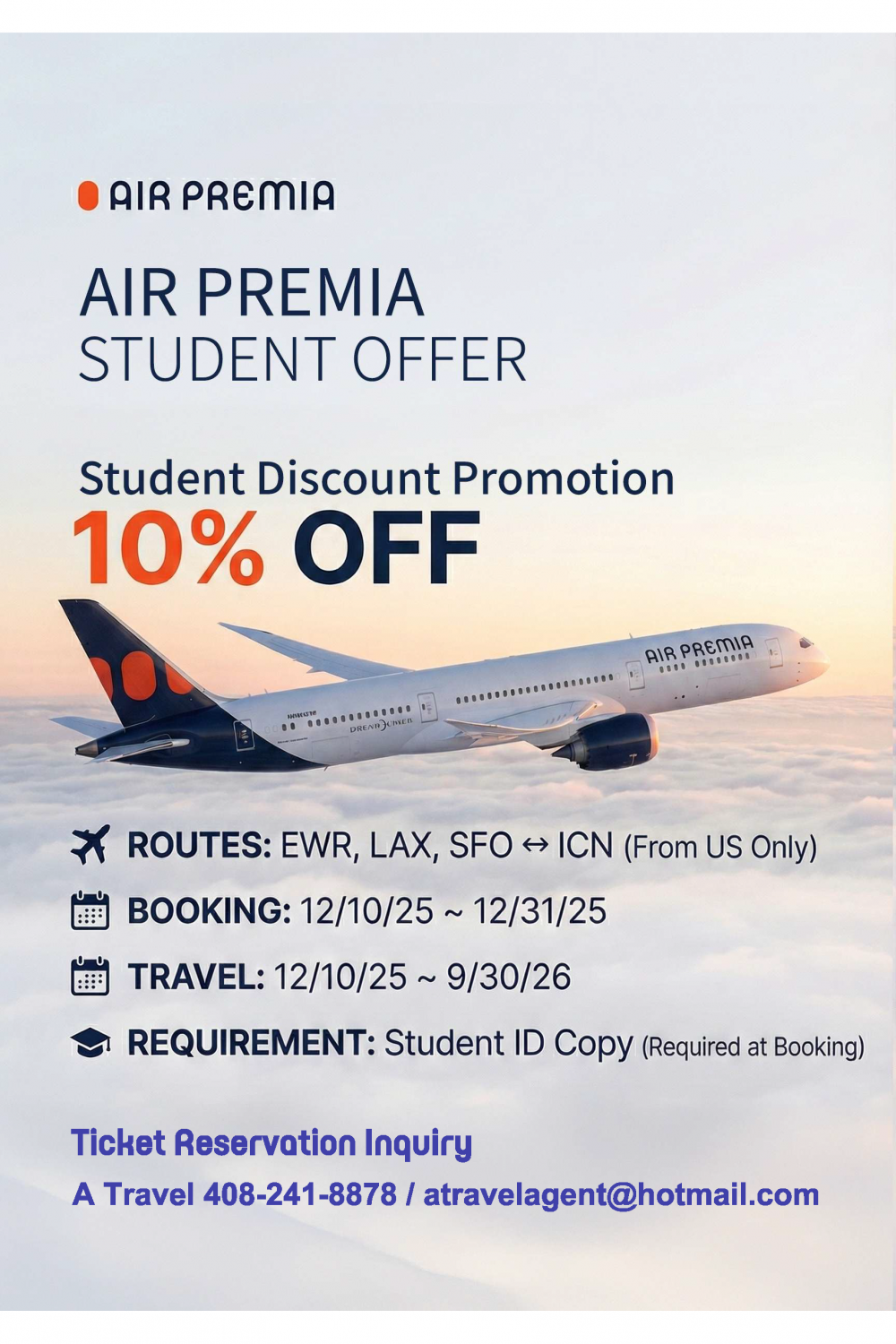 에어프레미아 미주 대학생 대상 할인 프로모션 안내 작성자 정보 Airpremia 쪽지보내기 메일보내기 자기소개 아이디로 검색 전체게시물 쪽지보내기 메일보내기 자기소개 아이디로 검색 전체게시물 작성 작성일 2025.12.10 15:18 컨텐츠 정보 117 조회 0 추천 0 비추천 목록 답글 게시글 쓰기 본문 에어프레미아에서 미주 대학생 대상 할인 프로모션 중입니다. 예약 및 발권 관련 지점 대리점으로 문의해 주시기 바랍니다. 0 추천 0 비추천 SNS 공유 관련자료 댓글 0 등록된 댓글이 없습니다. Select File Upload File 목록 답글 게시글 쓰기
