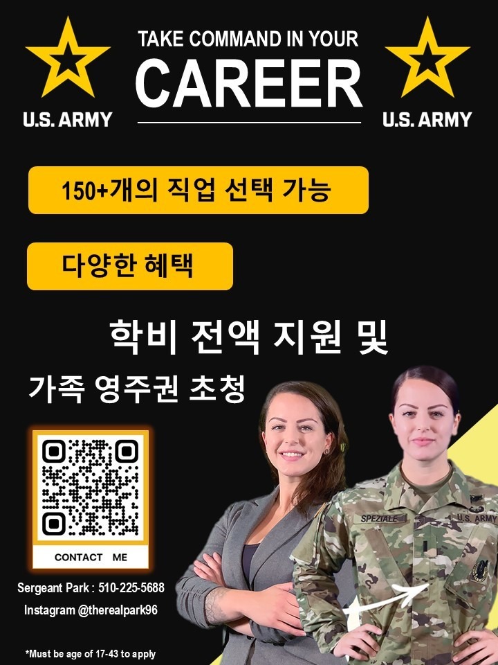 ***미국 시민권자 전용 특채 입대: 한국어 읽기/듣기 가능하신분은 보안 통역병으로 특별채용 입대를 통해 현금 보너스와 높은 계급이 보장됩니다. (마찬가지로 입대 시험 ASVAB 면제)***