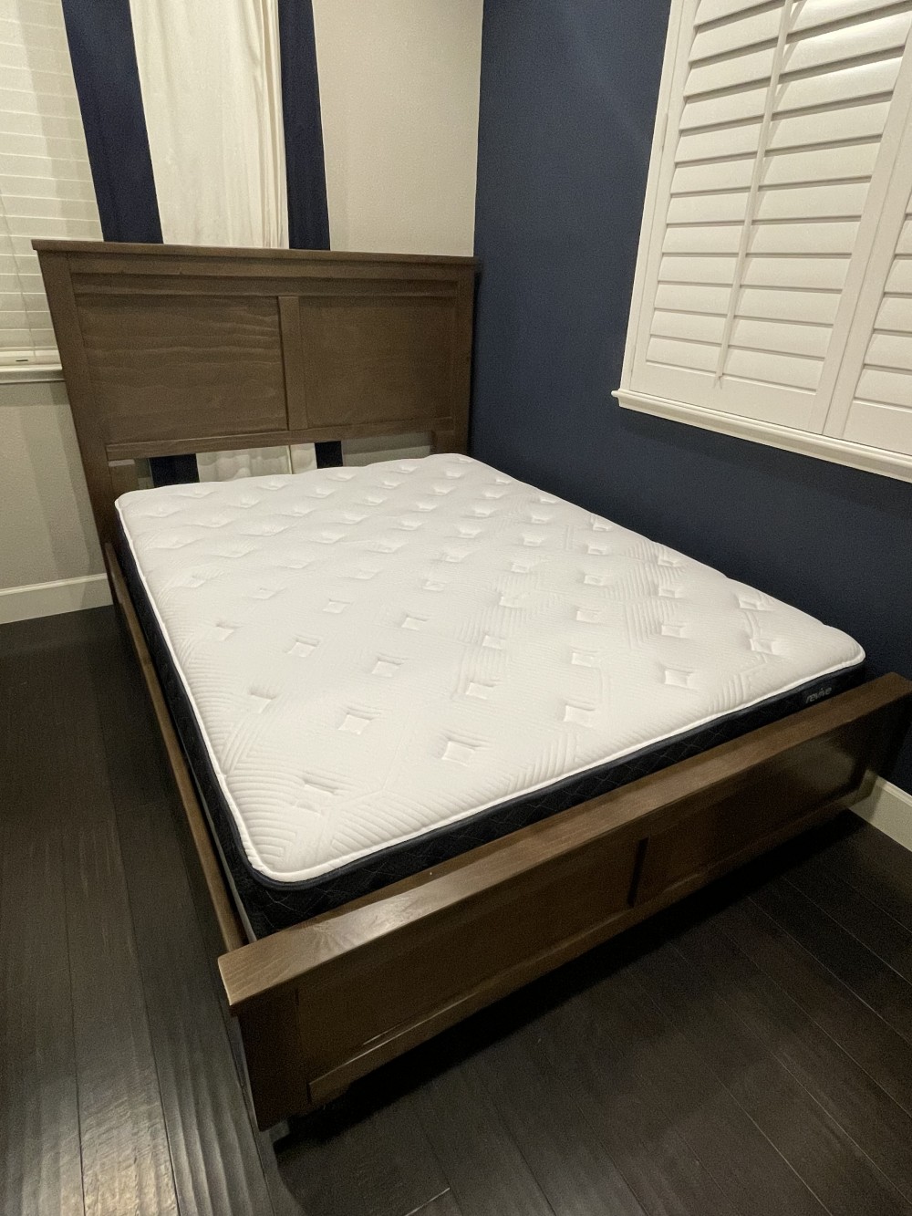 프레임은 예쁜 월넛 색에 마감이 매우 부드럽고 매트리스는 항상 두겹 이상 커버/보호 해놓아서 새하얗고 깨끗합니다
