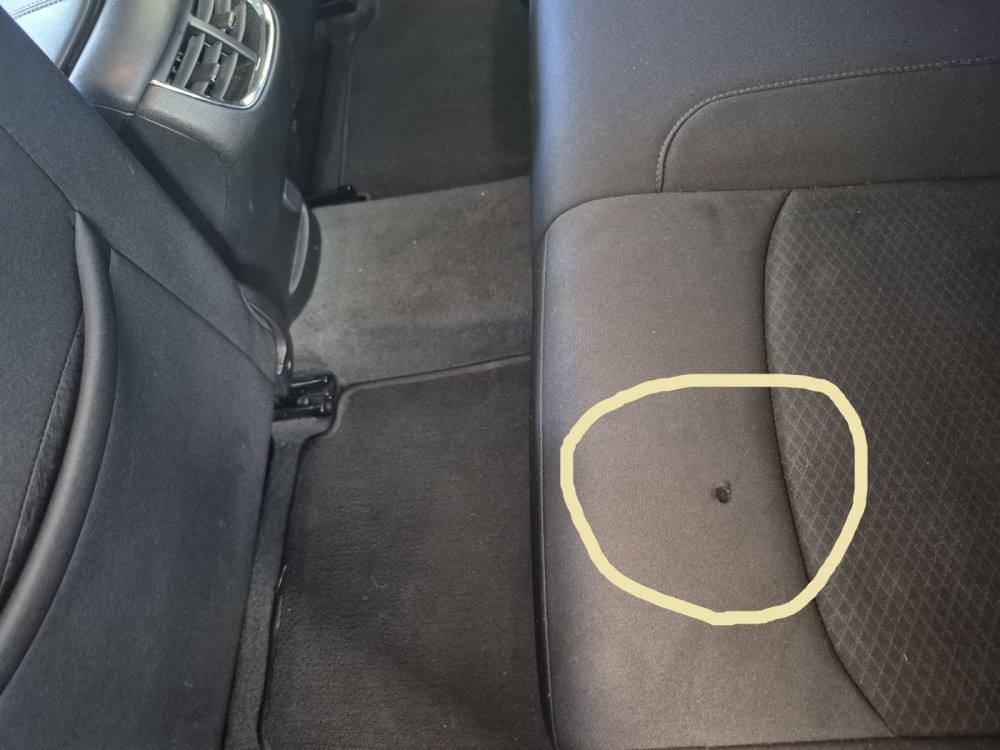 한가지 특이사항으로 뒷자석 왼쪽 시트에 새끼 손톱만한 수리 흔적이 있습니다. (사진참조) 손으로 만지면 해당부위에 까글한 편입니다. 구입 당시에 이미 존재했던 거라 참고 부탁드립니다.