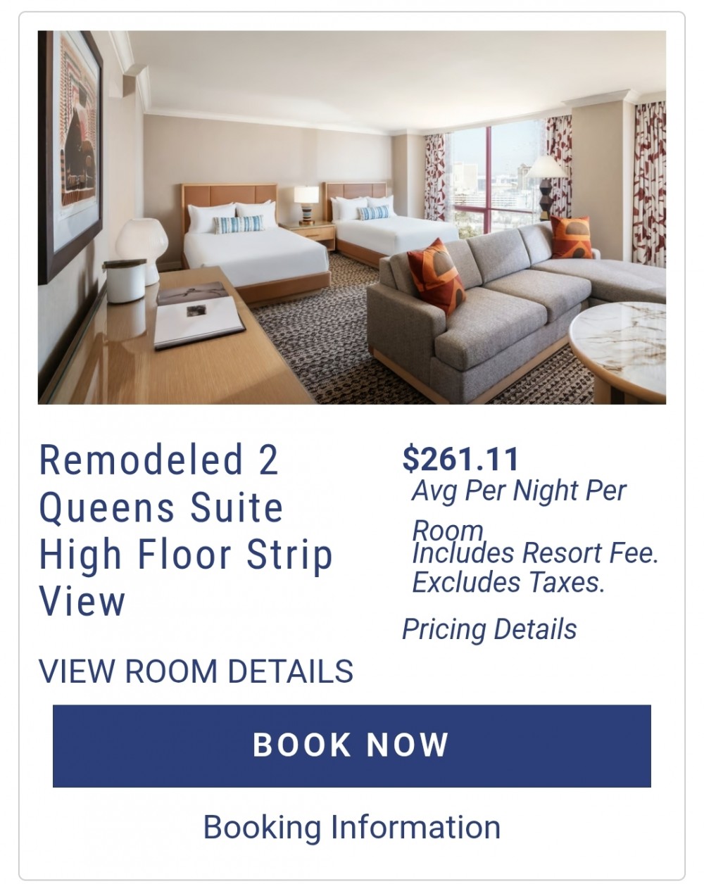 방 타입은 새로 리모델링된 2 queen bed suite, high floor, strip view 입니다. 스위트룸으로 소파도 있어서 5명 이상도 투숙 가능합니다.