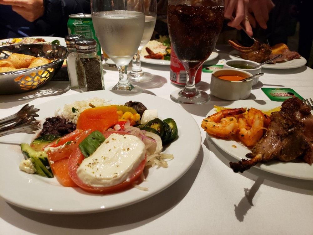 식당 가운데에 여러 음식이 놓인 뷔페 섹션이 있어 그 곳은 얼마든지 원하는 대로 가져다 먹을 수 있었고, 직원이 꼬챙이에 낀 고기 덩어리를 들고 테이블로 돌아 다니며 원하는 만큼 잘라 주는 시스템이었습니다.