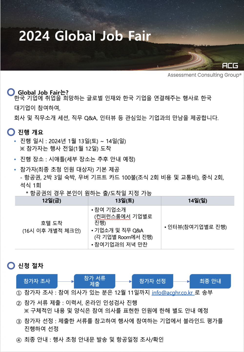 지난번에도 한번 전달 드렸는데, 업데이트 사항 있어서 다시 전달 드립니다. 내년 1월에 시애틀에서 국내 기업들이 참여하는 잡페어가 열립니다.