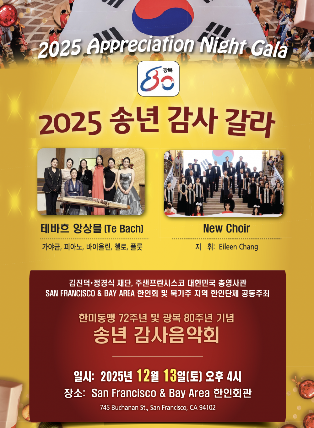 San Francisco & Bay Area 한인회(회장 김한일)는 한 해를 마무리하며 지역 동포들과 감사의 마음을 나누기 위한 ‘2025 송년 감사 갈라(Appreciation Night Gala)’를 오는 12월 13일(토) 오후 4시, 샌프란시스코 & Bay Area 한인회관(745 Buchanan St, San Francisco)에서 성대하게 개최한다. 이번 송년행사는 한미동맹 72주년과 광복 80주년이라는 뜻깊은 해를 기념하며, 한 해 동안 지역사회 곳곳에서 수고한 동포들과 한인 단체들에 감사의 마음을 전하고, 모두가 한마음으로 모여 화합을 다지는 의미 있는 자리로 마련될 예정이다.