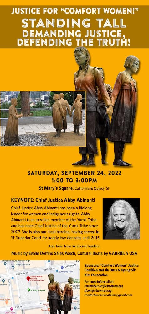 일본의 역사왜곡에 맞서 북가주 한인들의 참여와 기금모금으로 건립된 샌프란시스코 위안부 기림비가 설립 5주년을 맞아 기념식이 열린다. ‘위안부정의연대(CWJC)’ 와 함께 아직도 계속되고 있는 일본의 역사 왜곡과 위안부 강제 동원의 역사적 진실을 알리게 될 행사다. 또한 서울 남산 위안부 기림비 ‘정의를 위한 연대’ 건립 3주년 기념식도동시에 개최된다. 기림비 기념식을 통해 끔찍한 전쟁범죄의 재발을 방지하고 인권을 위한 목소리를 높이며 역사의 진실이 후세들 뿐 아니라 우리 주변에 널리 알려질 것으로 기대되고 있다.