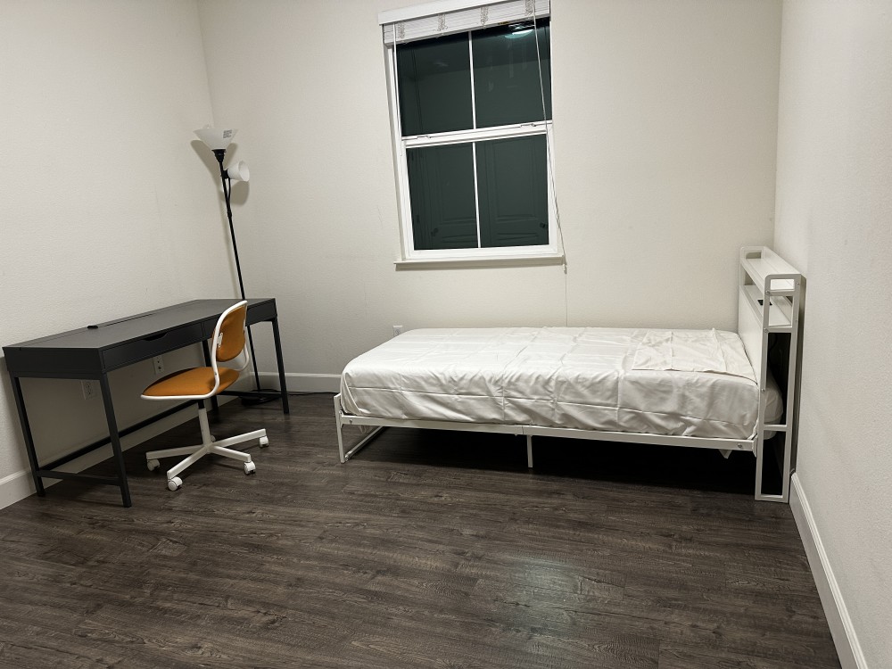 방에 침대, 책상, 의자, 스탠드, 큰 모니터, 중간크기의 NEW 냉장고, 전자렌지 구비되어 있어 생활하기 불편함 없습니다.